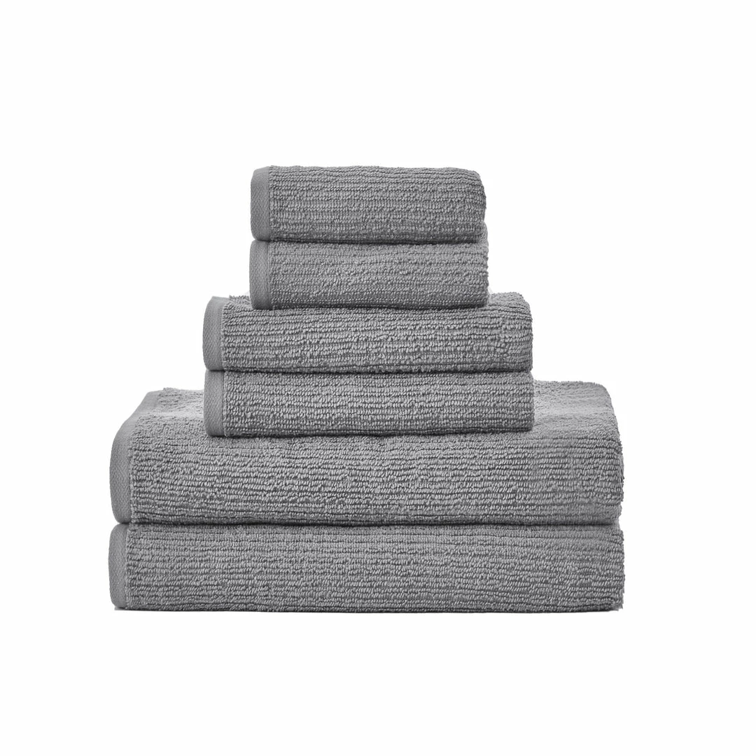 Designed with a zero-twist construction to help prevent linting, this 6-piece towel set made from quick-drying, highly-absorbent cotton terry showcases a subtle striped texture. 100% cotton Includes 2 bath towels, 2 hand towels, and 2 wash cloths. Bath towel – 56″ W X 30″ L. Hand towel – 28″ W X 16″ L. Wash cloth – 13″ W X 13″ L. Machine wash. Imported.