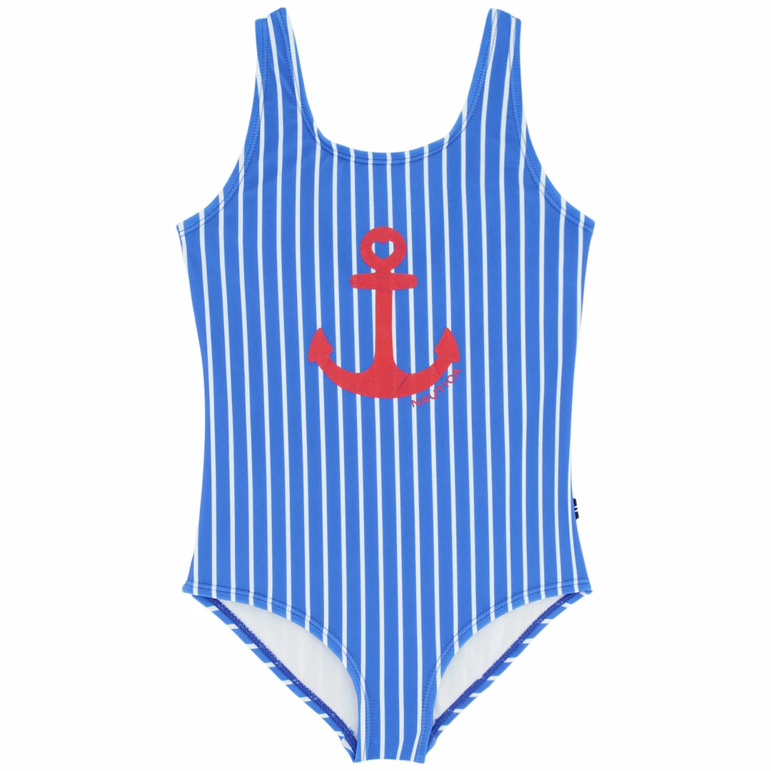 For sailing or swimming, this striped one-piece made with UPF 50+ gives your child both style and protection. It features a sparkling foil anchor design and straps for support and comfort. 82% polyester, 18% spandex. Quick dry fabric dries in minutes for all-day comfort. UPF 50+ Protection helps block harmful rays. Scoop neck. Tank straps. Moderate cut legs. Machine wash. Imported.