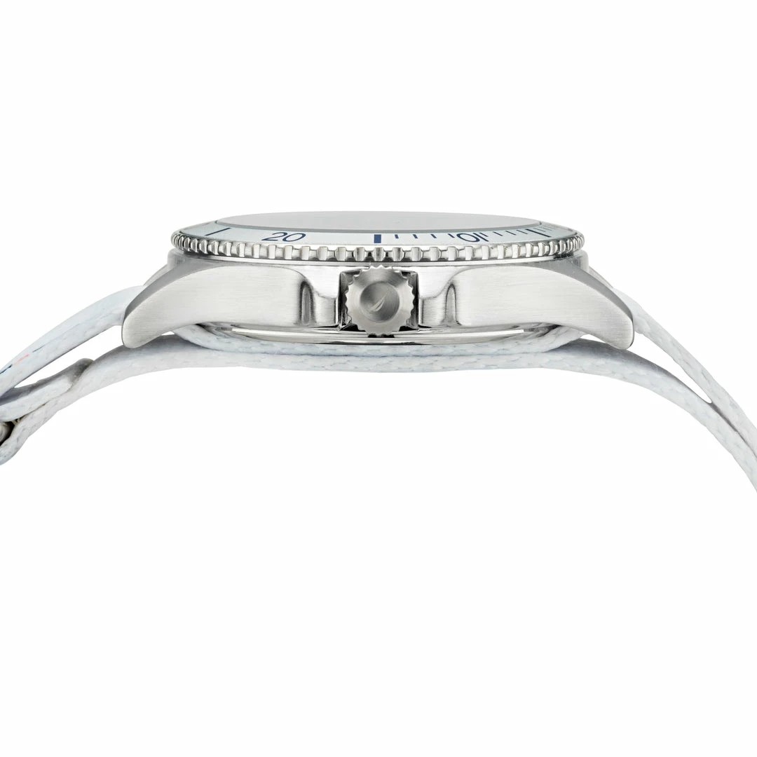 The case is made of durable Brass. The case width is 43mm and the dial is protected by a Mineral Crystal. It is water resistant up to 50 m (165 feet). The Strap is White Fabric and the dial is White. The movement of this timepiece is Quartz. (NAPBTP008)