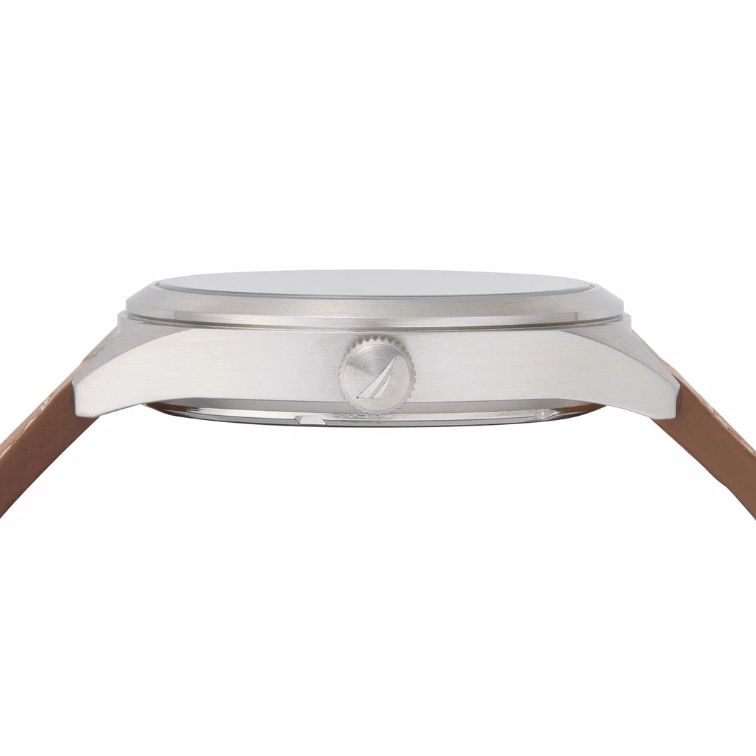 The case is made of durable Stainless Steel. The case width is 44mm and the dial is protected by a Mineral Crystal. It is water resistant up to 100 m (330 feet). The Strap is Brown Leather and the dial is Blue. The movement of this timepiece is Quartz. (NAPCFS914)
