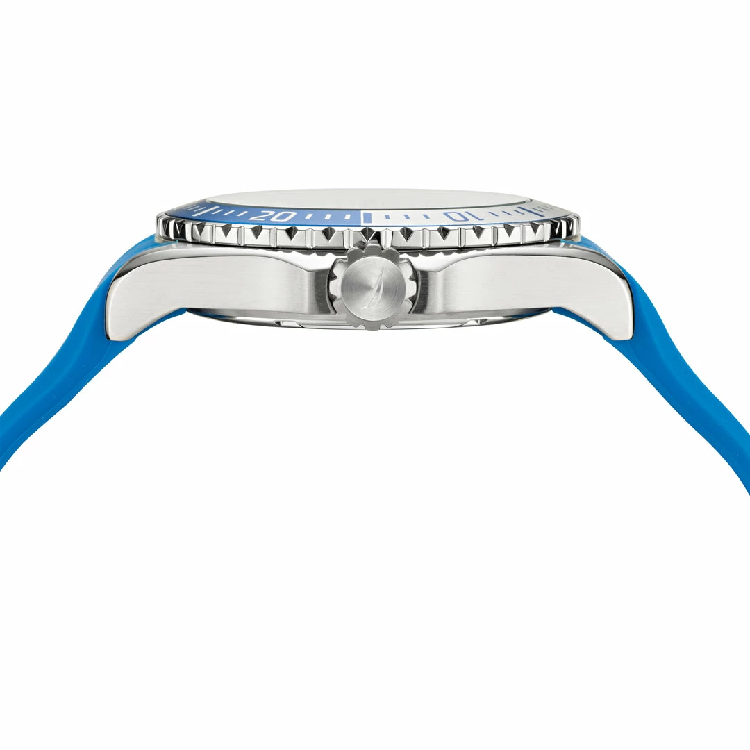 The case is made of durable Stainless Steel. The case width is 44mm and the dial is protected by a Mineral Crystal. It is water resistant up to 100 m (330 feet). The Strap is Blue Silicone and the dial is White. The movement of this timepiece is Quartz. (NAPCRF910)