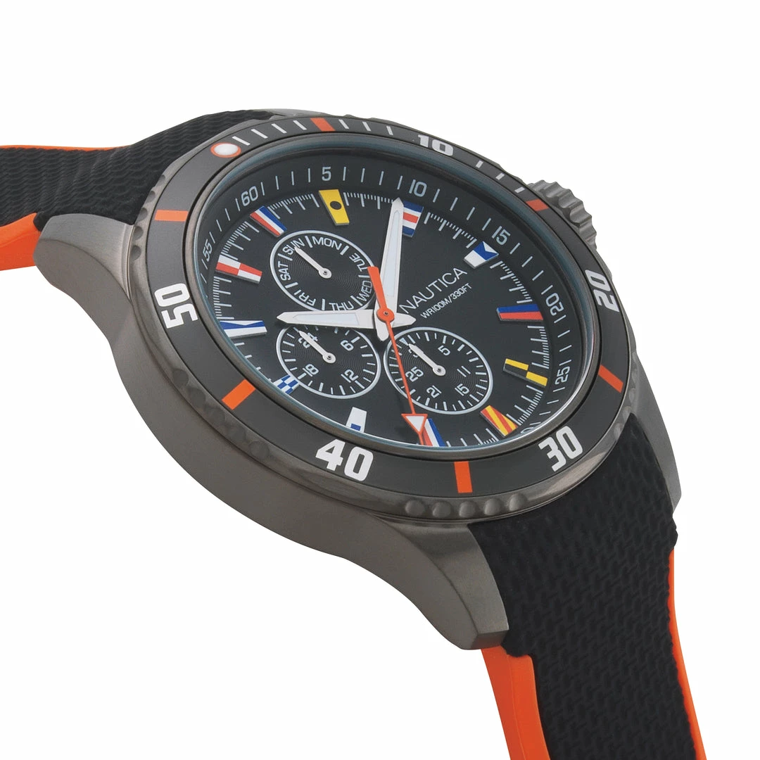The case is made of durable Stainless Steel. The case width is 44mm and the dial is protected by a Mineral Crystal. It is water resistant up to 100 m (330 feet). The Strap is Black Silicone and the dial is Black. The movement of this timepiece is Quartz. (NAPGLP004)