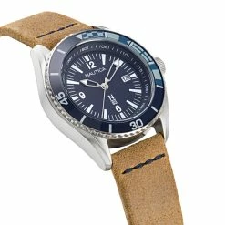 The case is made of durable Stainless Steel. The case width is 44mm and the dial is protected by a Mineral Crystal. It is water resistant up to 50 m (165 feet). The Strap is Brown Leather and the dial is Blue. The movement of this timepiece is Quartz. (NAPUSS903)