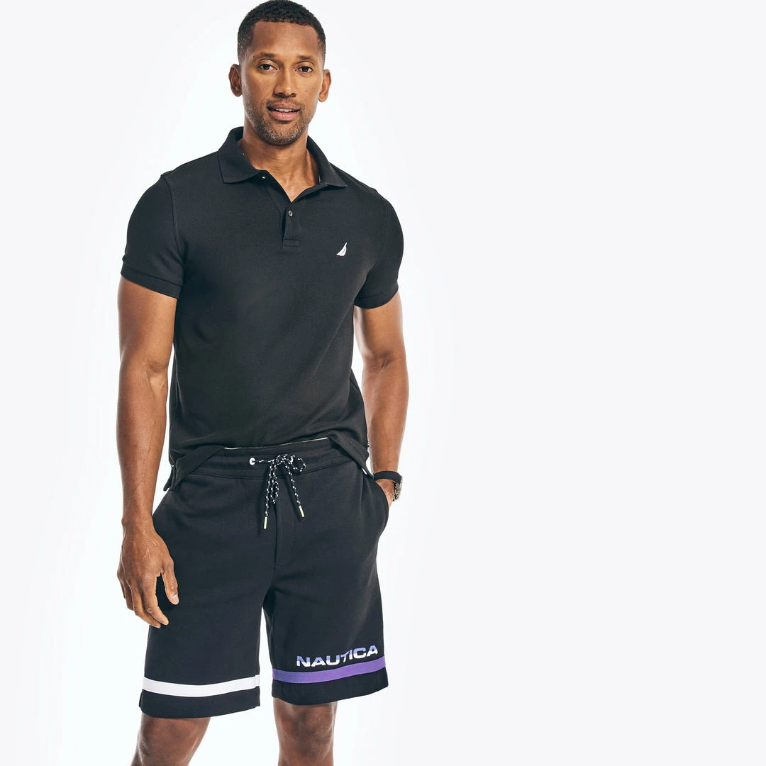 Designed with a comfortable elastic-drawstring waist, this soft cotton-jersey knit short will be your go-to style whether you are kicking back at home or running errands. 67% cotton, 33% polyester. Elastic-drawstring waist. Side welt pockets. Back patch pocket. Logo at hem. 9″ inseam. Classic fit. Machine wash. Imported. From the Competition collection.