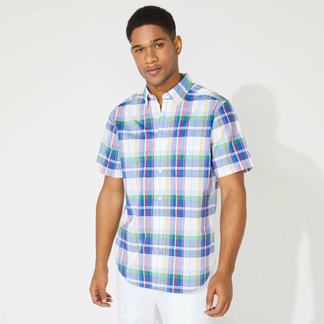 Cut in a classic-fit, this tailored plaid button-up is made from soft stretch-cotton to move with you throughout your day. 98% cotton, 2% elastane Buttoned collar; button front closures. Classic fit; short sleeve; patch chest pocket. Machine wash. Imported.
