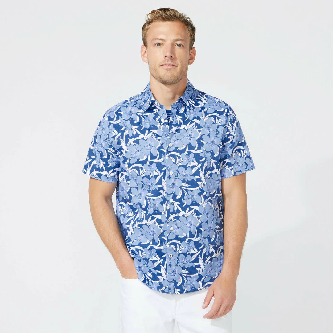 Made with moisture-wicking fabric and active stretch for a flexible, comfortable fit, this floral-print shirt is the perfect style for your next getaway. 98% cotton, 2% elastane Button closures; button-down collar. Classic-fit; short sleeves; J-class logo at chest. Machine wash. Imported.