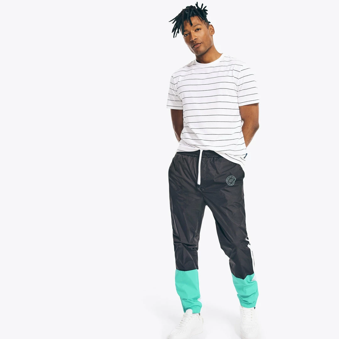Go from basic to bold with this colorblock track pant. The contrast details and our signature logo at the hip will instantly elevate your casual look. 100% nylon. Elastic-drawstring waist. Front slant pockets. Back button-welt pocket. Classic fit. Machine wash. Imported.