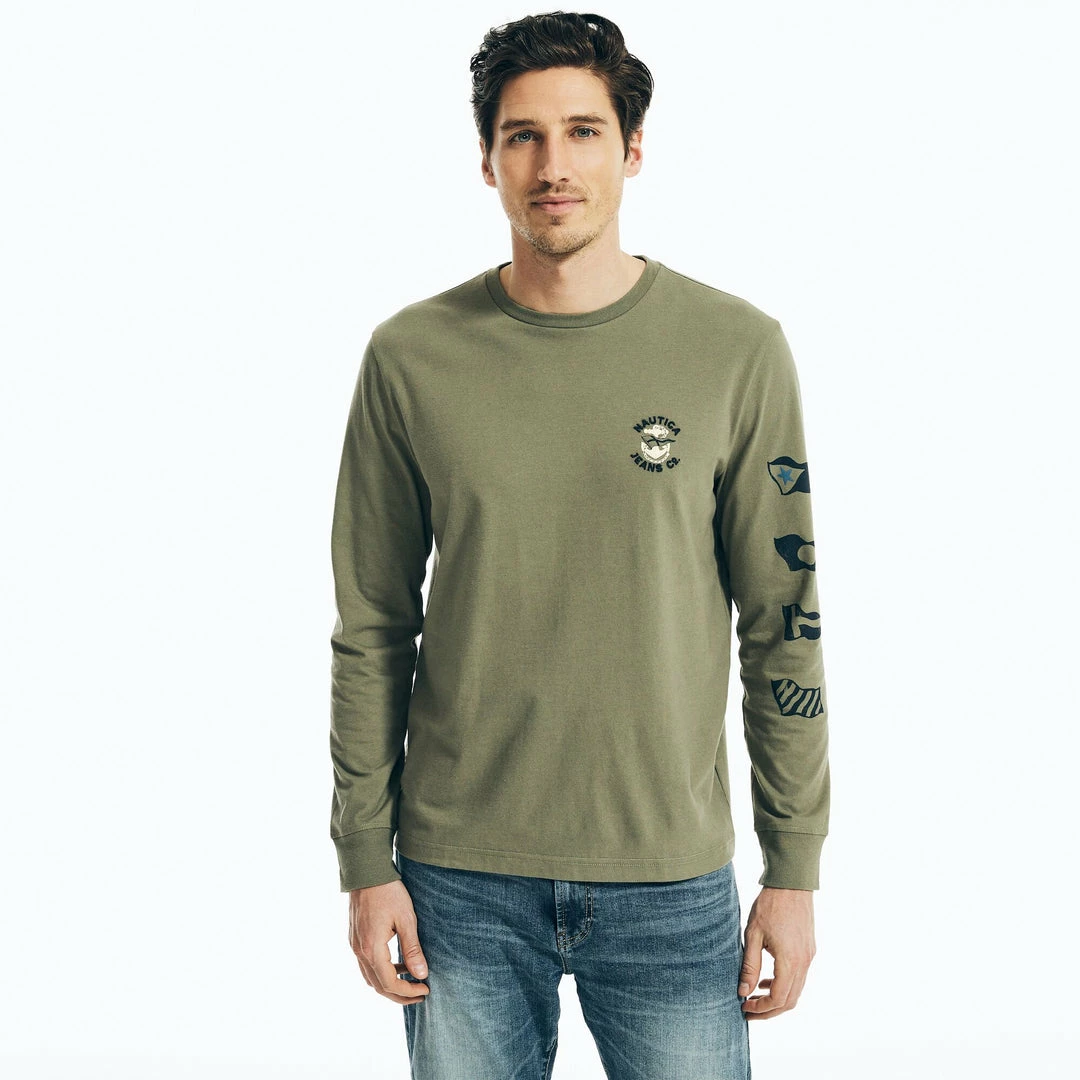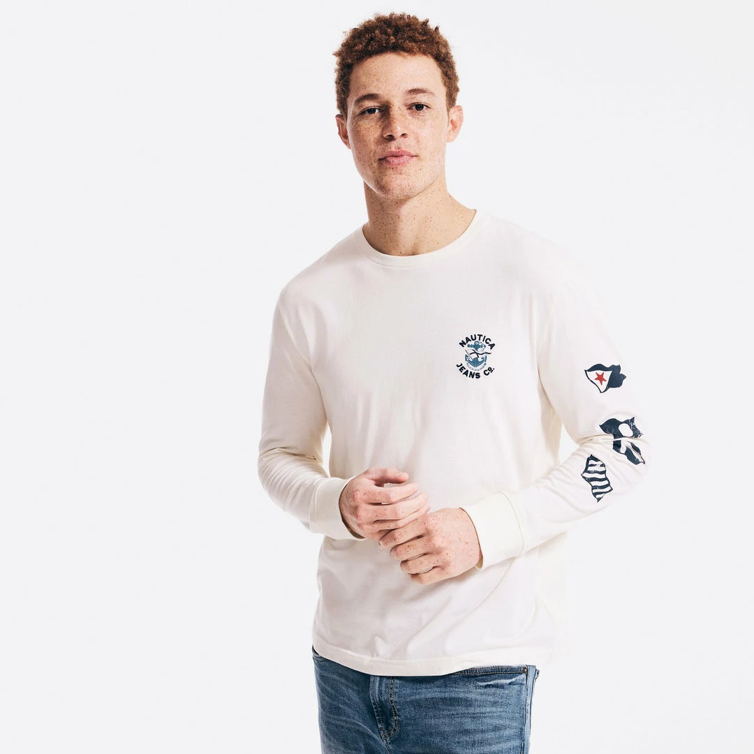 Keep your style relaxed for your off-duty days with this graphic long sleeve t-shirt made from Sustainably Crafted cotton-jersey. From the Nautica Jeans Co. and Sustainably Crafted collection. 60% cotton, 40% recycled polyester Classic fit. Crewneck. Ribbed collar. Long sleeves. Ribbed cuffs. Machine wash.