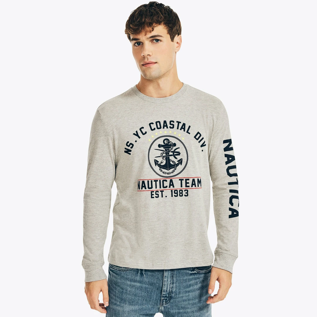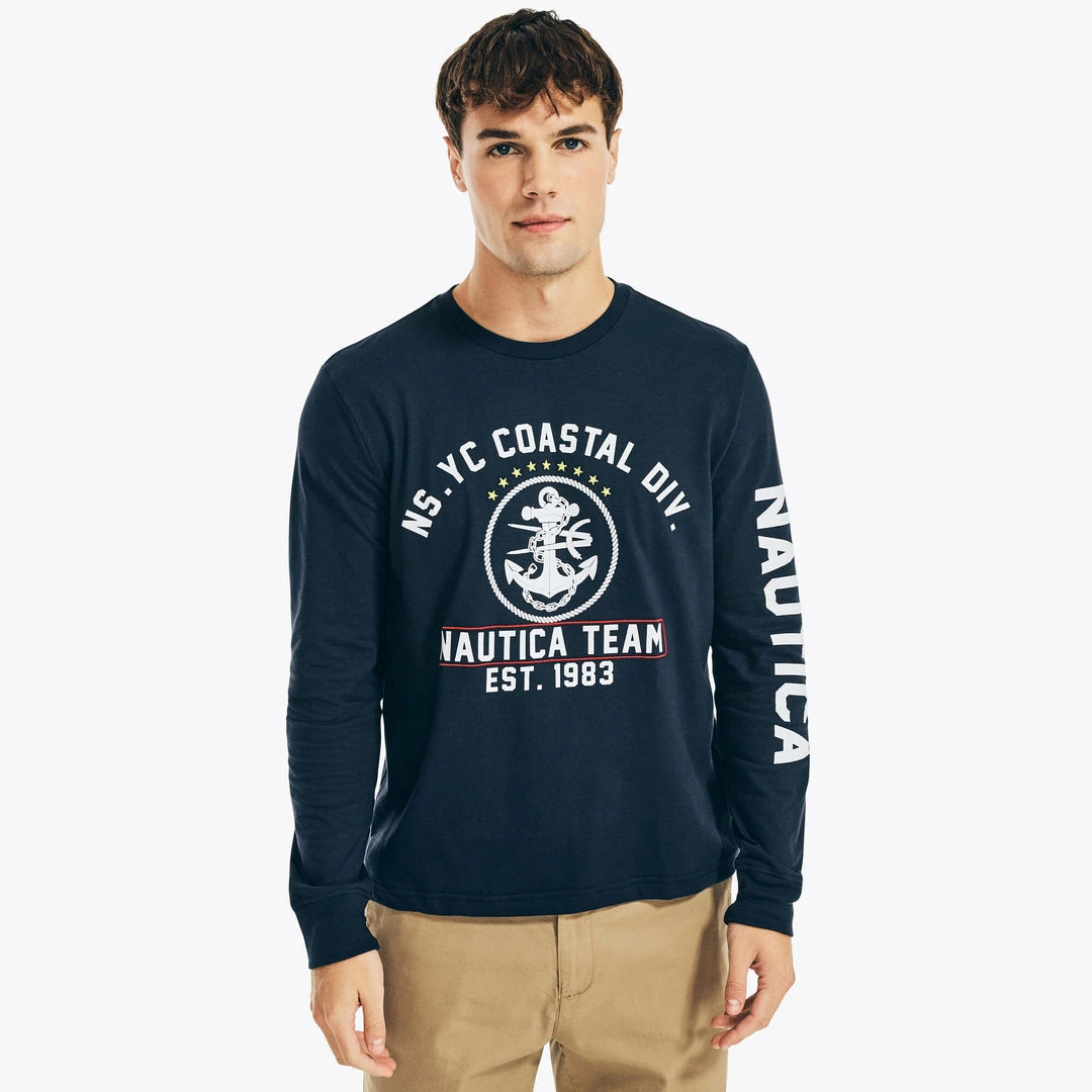 Keep your style relaxed for your off-duty days with this graphic long sleeve t-shirt made from Sustainably Crafted cotton-jersey. From the Nautica Jeans Co. and Sustainably Crafted collection. 60% cotton, 40% recycled polyester Classic fit. Crewneck. Ribbed collar. Long sleeves. Ribbed cuffs. Machine wash.