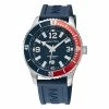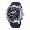 Designed with a textured silicone strap, this athletic Ocean Beach watch features a 49 mm stainless steel case with chronograph movement. The dial has three small subdials that display the day, date, and 24 hours. 60% stainless steel, 40% silicone 49 mm case with mineral glass crystal. Top ring. Date at 4 o’clock. Adjustable 22×20 silicone strap fits up to 8 in. wrist circumference. Buckle closure. Water-resistant up to 100m (330ft).