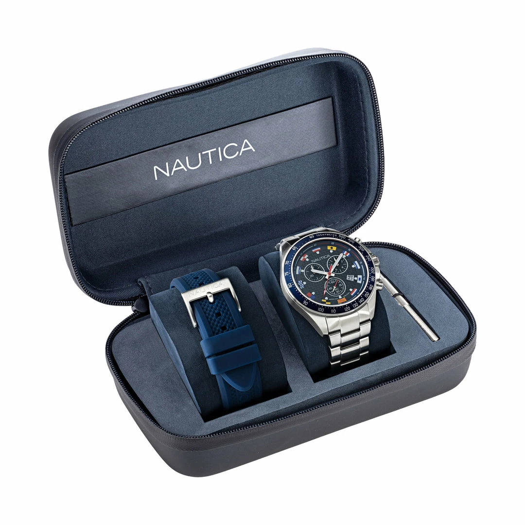Choose your style with this lustrous stainless steel Ocean Beach watch box set. Styled with a silicone strap and stainless steel link bracelet band, this chronograph-movement timepiece is enriched with a chessboard pattern and 3 subdials that display the day, date, and time. 40% stainless steel, 60% silicone 46mm case. Chronograph movement. Water-resistant up to 100m. Deployment folding clasp and buckle closure. Imported.