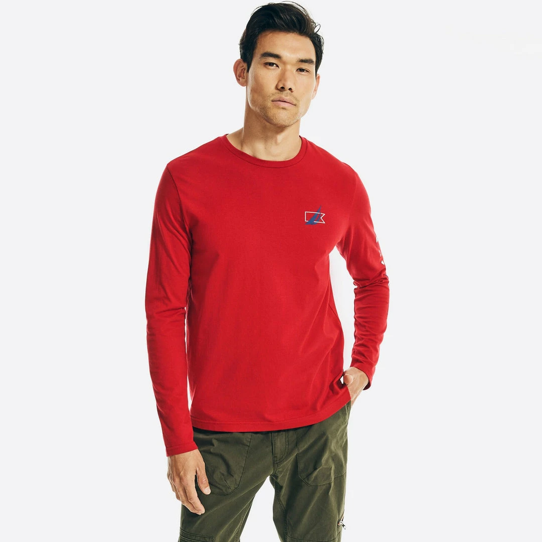 When there’s a slight chill, effortlessly transition from your classic tees into this long sleeve style made from soft, Sustainably Crafted cotton-jersey. It features a multiple flag graphic along the sleeve with an oversized print at the back. From the Sustainably Crafted collection. 60% cotton, 40% recycled polyester Classic fit. Crewneck. Ribbed collar. Long sleeves. Machine wash.