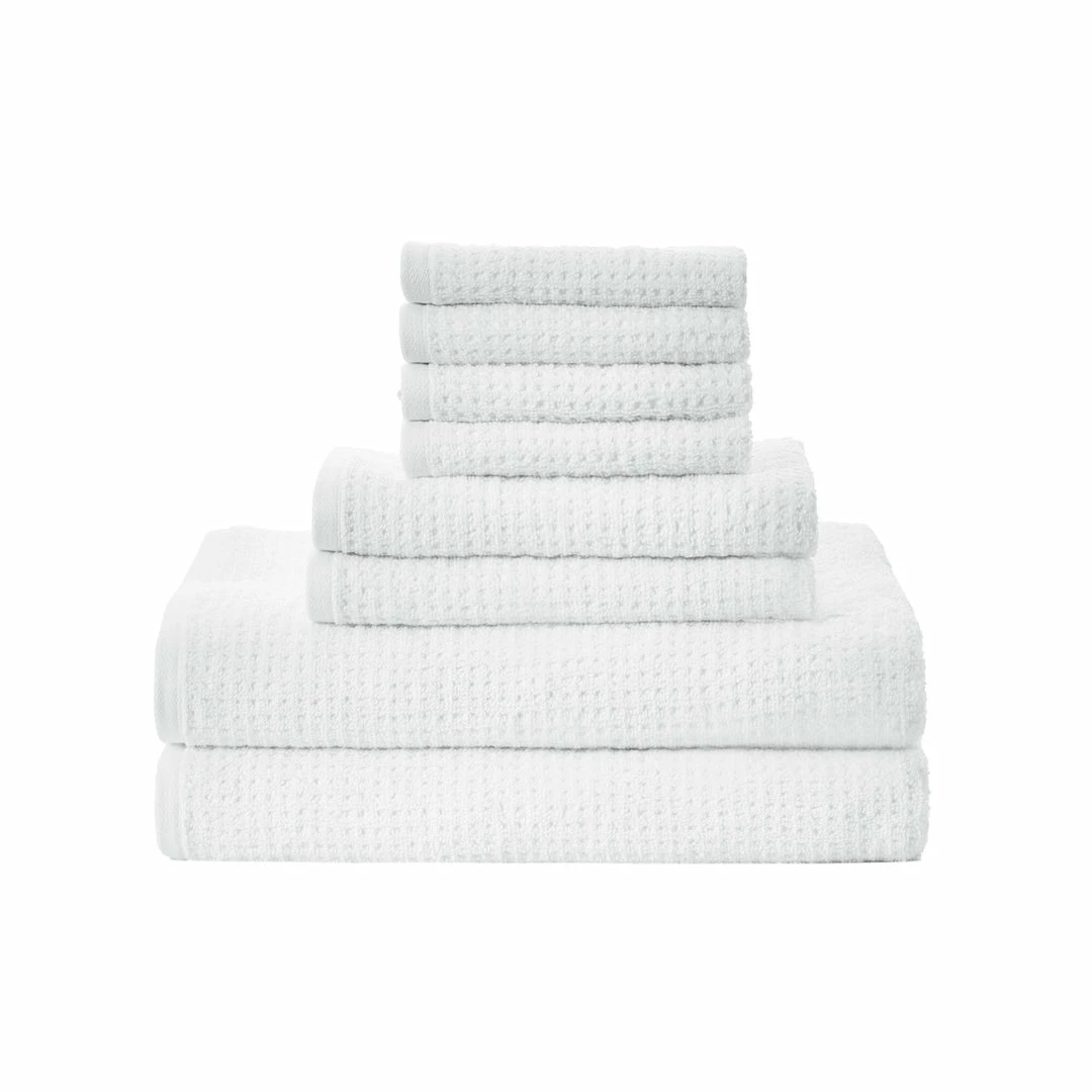 Designed with a zero-twist construction to help prevent linting, this 8-piece towel set made from quick-drying, highly-absorbent cotton terry showcases a classic allover waffle texture. 100% cotton Includes 2 bath towels, 2 hand towels, and 4 wash cloths. Bath towel – 56″ W X 30″ L. Hand towel – 28″ W X 16″ L. Wash cloth – 13″ W X 13″ L. Machine wash. Imported.