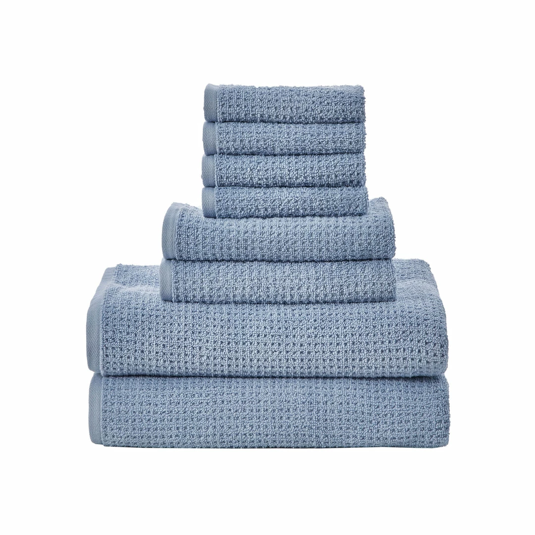Designed with a zero-twist construction to help prevent linting, this 8-piece towel set made from quick-drying, highly-absorbent cotton showcases a classic allover waffle texture. 100% cotton Includes 2 bath towels, 2 hand towels, and 4 wash cloths. Bath towel – 56″ W X 30″ L. Hand towel – 28″ W X 16″ L. Wash cloth – 13″ W X 13″ L. Machine wash. Imported.