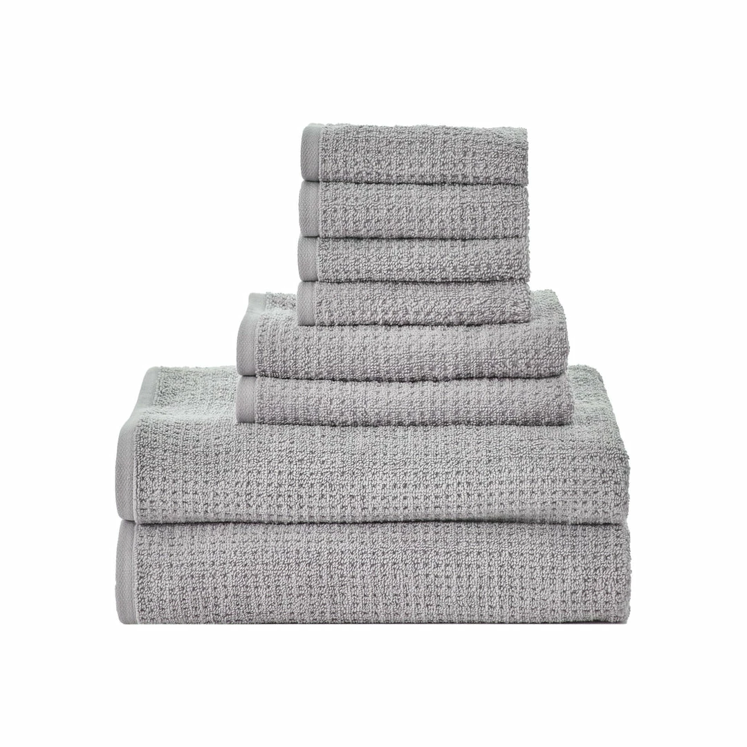 Designed with a zero-twist construction to help prevent linting, this 8-piece towel set made from quick-drying, highly-absorbent cotton terry showcases a classic allover waffle texture. 100% cotton Includes 2 bath towels, 2 hand towels, and 4 wash cloths. Bath towel – 56″ W X 30″ L. Hand towel – 28″ W X 16″ L. Wash cloth – 13″ W X 13″ L. Machine wash. Imported.
