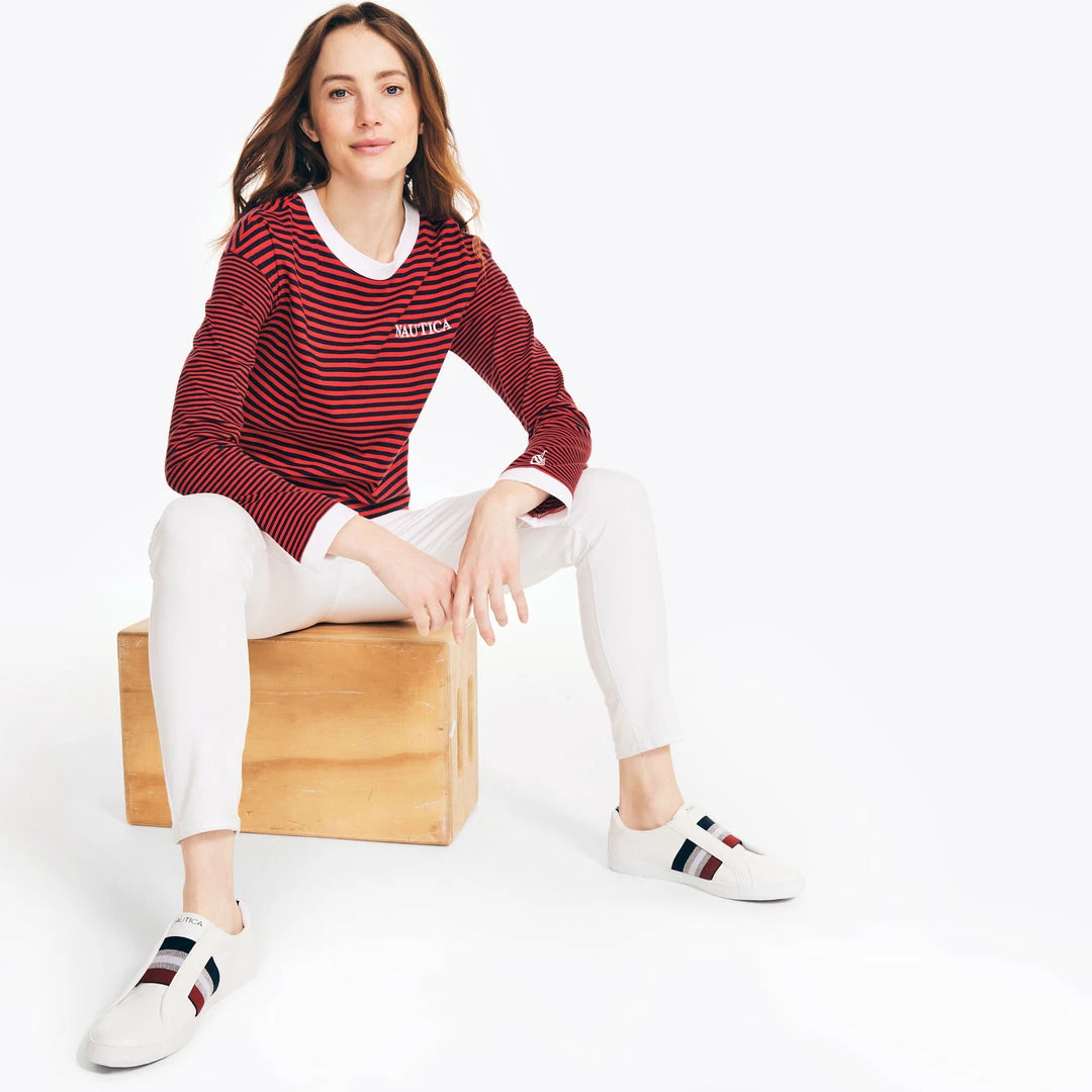Cut for a cropped style, this long-sleeve stripe tee made from soft cotton-knit features a classic crewneck complete with our retro logo embroidered at the chest and sleeve. 100% cotton. Classic fit. Crewneck. Ribbed collar. Long sleeves. Ribbed cuffs. Logo at chest and sleeve. Machine wash. Imported.