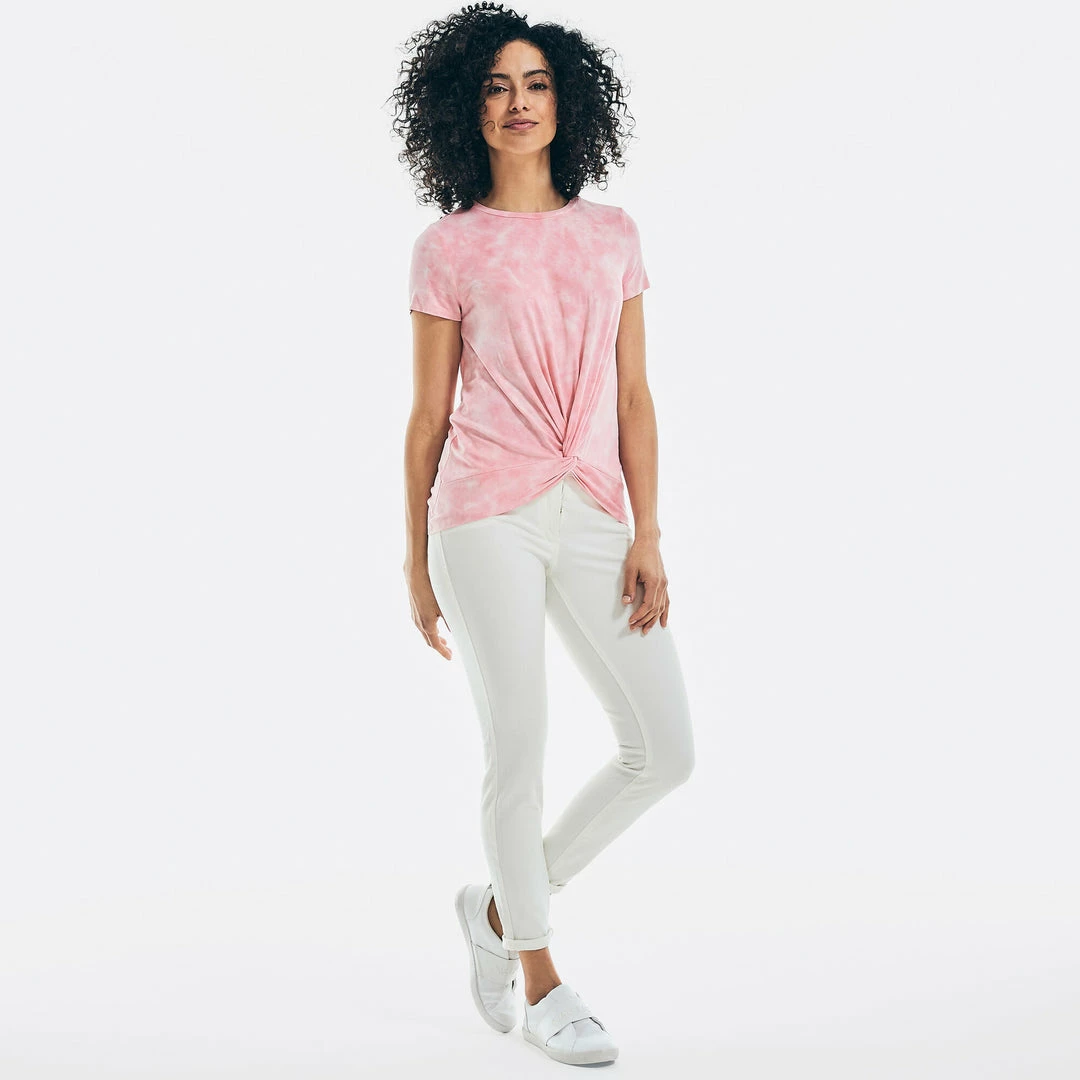 For a twist on the tie-dye trend, slip on this soft knit top featuring a classic crewneck, a knot at the front, and our iconic J-class logo at the hem. 95% rayon, 5% elastane Classic fit. Crewneck. Twist front. Logo at hem. Short sleeves. Machine wash.